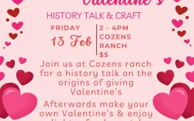 Join us at Cozens Ranch for a history talk on the origins of giving Valentine’s. Afterwards make your own Valentine’s