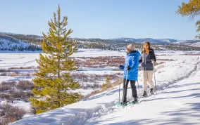 Glide through a snow-covered landscape on skis or snowshoes as twilight settles on your journey to a cozy yurt tucked
