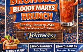 Sunday Funday at Fontenot's! The 3 Bs are here: Broncos, Bloody Mary's, & Brunch. Details: $7 Bloody Mary Bronco Burger