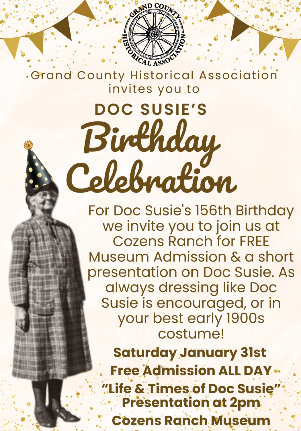 77849 US-40Fraser, CO 80442For Doc Susie's 156th Birthday we invite you to join us at Cozens Ranch for FREE Museum Admission & a short presentation on Doc Susie. As always dressing like Doc Susie is encouraged, or in your best early 1900s costume!Saturday January 31st