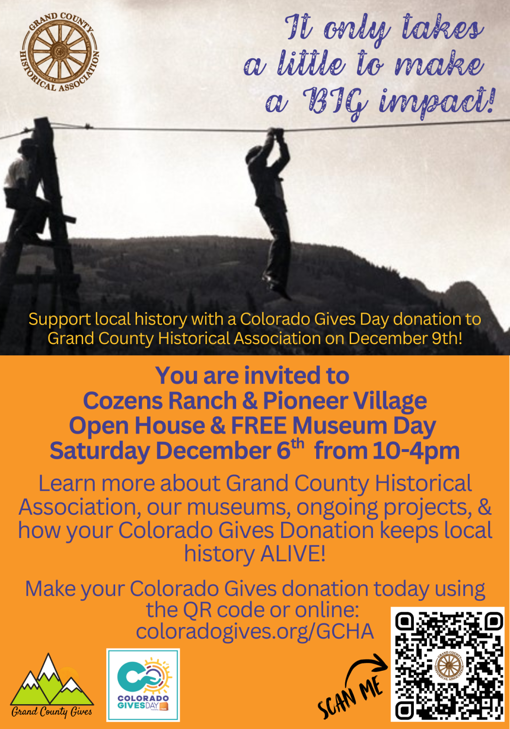 Saturday December 6th from 10-4pmLearn more about Grand County Historical Association, our museums, ongoing projects, & how your Colorado Gives Donation keeps local history ALIVE!Make your Colorado Gives donation today online: coloradogives.org/GCHA